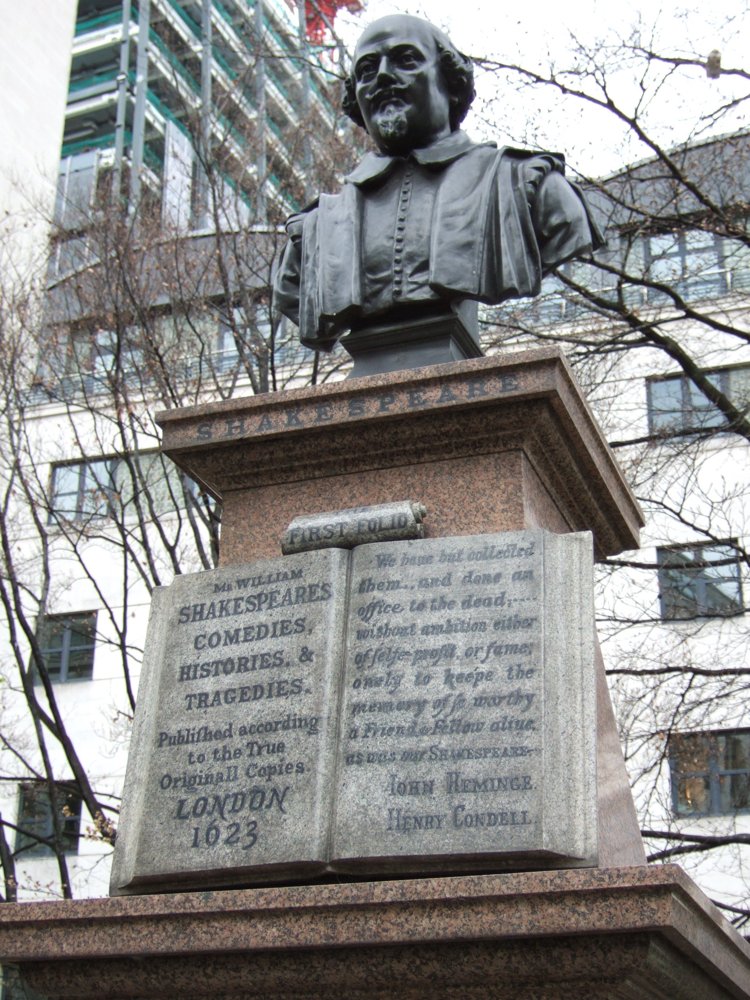 While the bust of Shakespeare sits proudly on top of the memorial, the plaques on the main body are dedicated to Condell and Heminge.