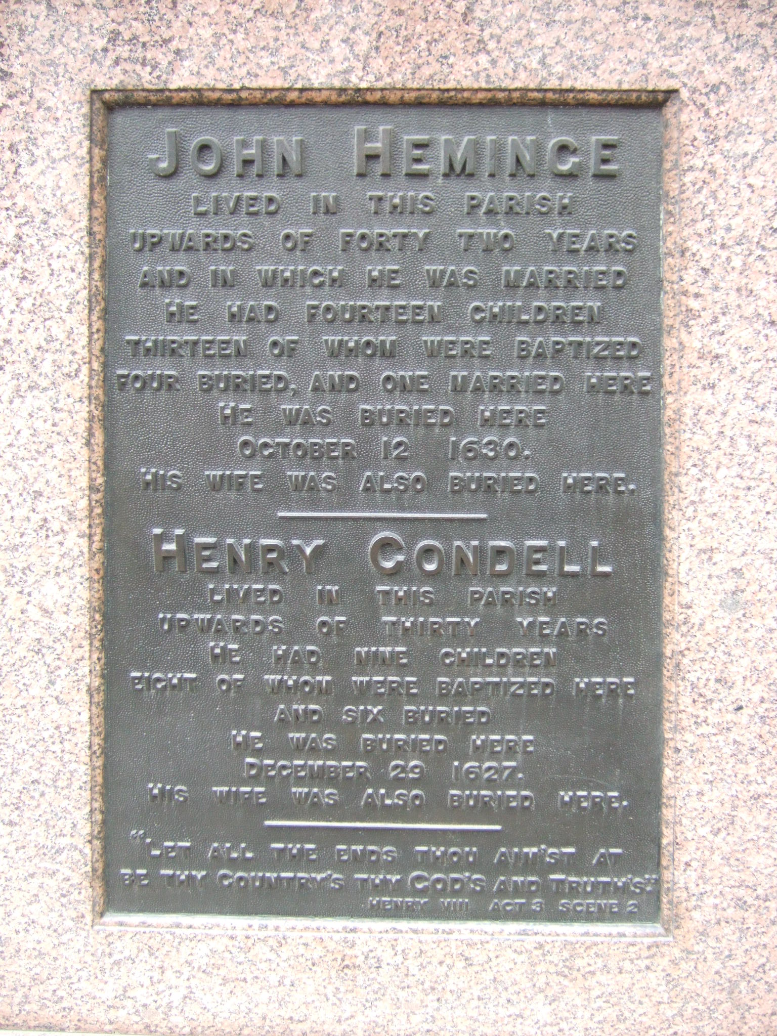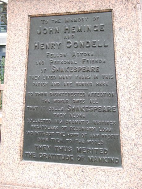 To the memory of JOHN HEMINGE and HENRY CONDELL, fellow actors and personal friends of SHAKESPEARE. They lived many years in this parish and are buried here.