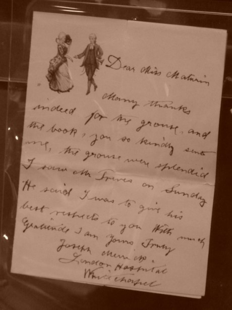 Merrick entertained visitors much as did in the vacant greengrocer’s across the road, although now those who came to see him were aristocrats and did their best to hide their horror. He wrote them charming, courteous and childlike letters once they’d gone – the only surviving example known is on display in the museum.