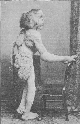 When I first became aware of this phenomenon the exhibition was closed, but a well-informed boy sought the proprietor in a public house and I was granted a private view on payment of a shilling. The shop was empty and grey with dust. Some old tins and a few shrivelled potatoes occupied a shelf and some vague vegetable refuse the window. The light in the place was dim, being obscured by the painted placard outside. The far end of the shop—where I expect the late proprietor sat at a desk—was cut off by a curtain or rather by a red tablecloth suspended from a cord by a few rings. The room was cold and dank, for it was the month of November. The year, I might say, was 1884. The showman pulled back the curtain and revealed a bent figure crouching on a stool and covered by a brown blanket. In front of it, on a tripod, was a large brick heated by a Bunsen burner. Over this the creature was huddled to warm itself. It never moved when the curtain was drawn back. Locked up in an empty shop and lit by the faint blue light of the gas jet, this hunched-up figure was the embodiment of loneliness. It might have been a captive in a cavern or a wizard watching for unholy manifestations in the ghostly flame. Outside the sun was shining and one could hear the footsteps of the passers-by, a tune whistled by a boy and the companionable hum of traffic in the road.