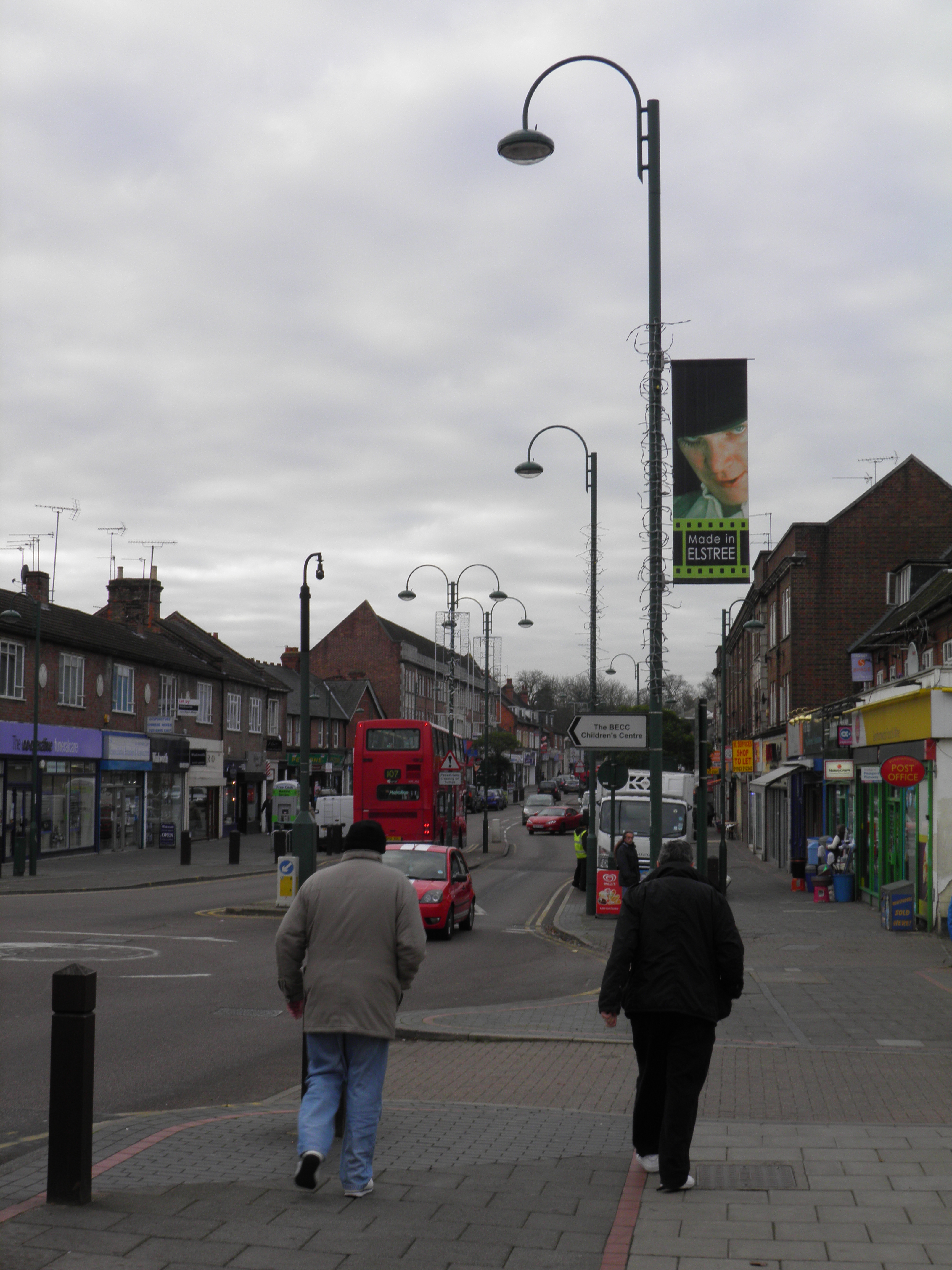 The town’s fortunes have always been linked to the rise and fall of the nearby studios, and the long, steady decline in the British film industry over the last forty years have been reflected in the surrounding area. Nowadays, Borehamwood is a long, bleak strip of charity shops, orange-hued greasy spoons, tatty pawn shops and grim, boarded-up frontages.