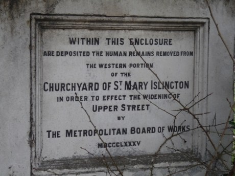 Even people who had already been buried within the boroughs weren’t safe once the new cemetery opened; many old graves were disinterred and the remains shunted over to the new cemetery. One particularly unpleasant reason for this is trumpeted on a triumphant memorial plaque: Upper Street in Islington was being widened, and the old burial grounds were in the way.
