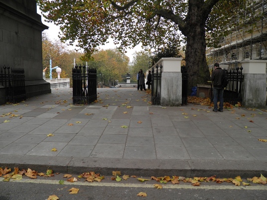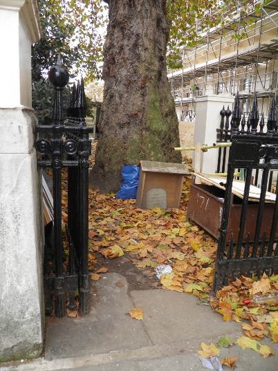 At the time, builders were excavating a strip of land in front of no.9 Carlton House Terrace to create a deep underground car park which now cuts between the small patch of ground the gravestone is on and the building. A German man walking down the Duke of York steps noticed the gravestone propped up underneath one of the trees and recalled that von Hoesch was the former ambassador.