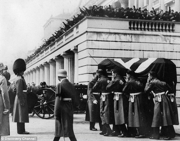 Some startling newsreel footage was taken as the funeral procession made its way down the Mall. At the top of the Duke of York steps, German Embassy staff gave the Nazi salute as von Hoesch’s coffin, wrapped in a swastika flag, headed out of Carlton House Terrace towards Buckingham Palace.